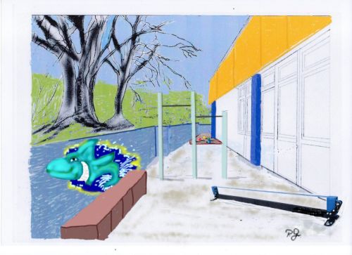 Ein Künstler gestaltet die angrenzende Betonmauer bunt und altersgemäß mit einer Schülergruppe, der Umwelt AG. Hierbei werden wir von der Kinder- und Jugendgalerie, dem Künstler Yorkar (ein ehemaliger Schüler der GHS) und dem Kulturamt unterstützt.