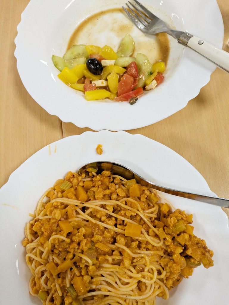 Unser Kurs WP 10 Sport und gesunde Ernährung hat heute Bolognese mit Soja und Nudeln gekocht. Dazu gab es einen Hirtensalat und Minz-Wasser. Es ist ein Gericht, das sehr schnell zubereitet werden kann. Und es lag nicht nur daran, dass wir eine Fachkraft an unserer Seite hatten. Heute haben wir ehrenamtliche Unterstützung von Herrn Rittner erhalten, der gelernter Koch ist und uns auch in der Zukunft unter die Arme greifen möchte. Wir danken Herrn Rittner, denn es war lecker.